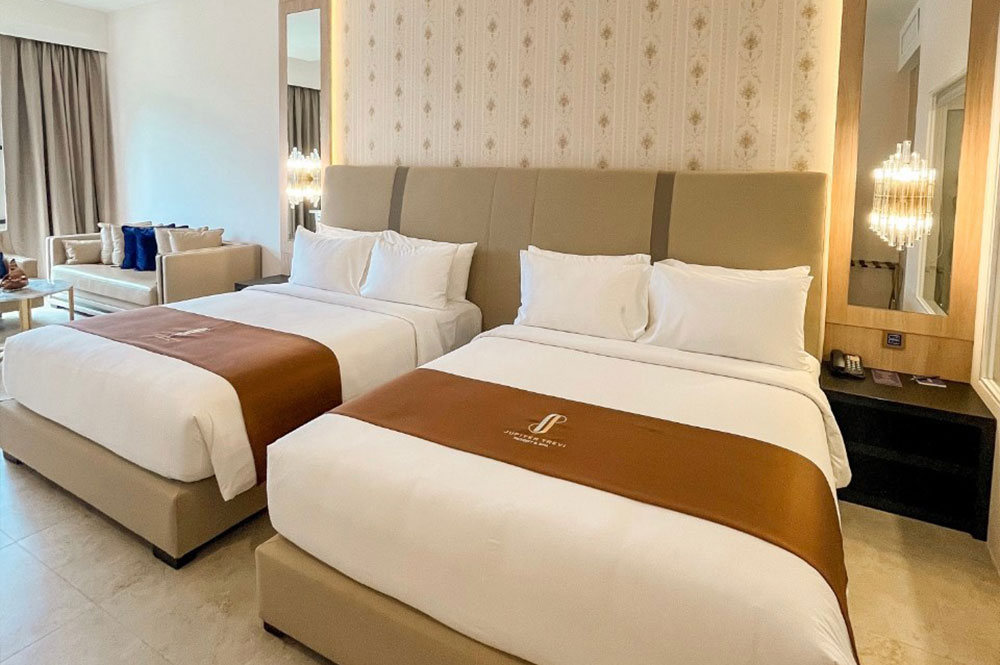 Presidential, a spacious 48 square metres 1 bathroom, two queen size beds and a Jacuzzi bath.